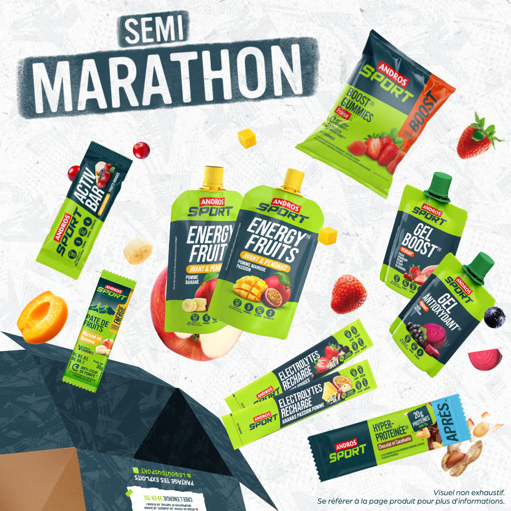 Vous l’attendiez tous, le voici : le pack semi-marathon Andros Sport. Ce pack regroupe l’ensemble des produits pour vous apporter de l’énergie, être votre bouclier antioxydant, votre recharge en minéraux et être votre soutien musculaire grâce à l’apport de protéines.Pack pensé et développé pour vous accompagner dans toutes les étapes du jour J : avant le départ, pendant l’effort, après votre semi. Soyez prêts à atteindre vos objectifs et à vous surpasser grâce au pack semi-marathon Andros Sport, réunissant :